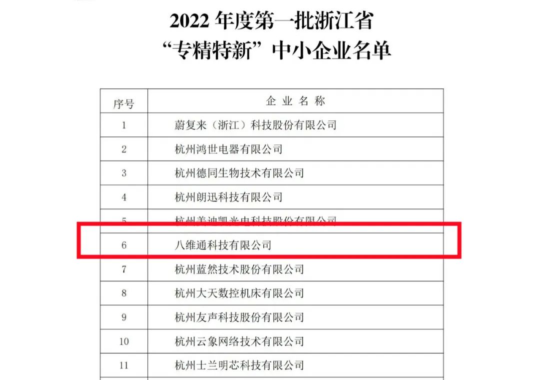 喜訊 | 八維通獲評浙江省“專精特新”企業(yè)!